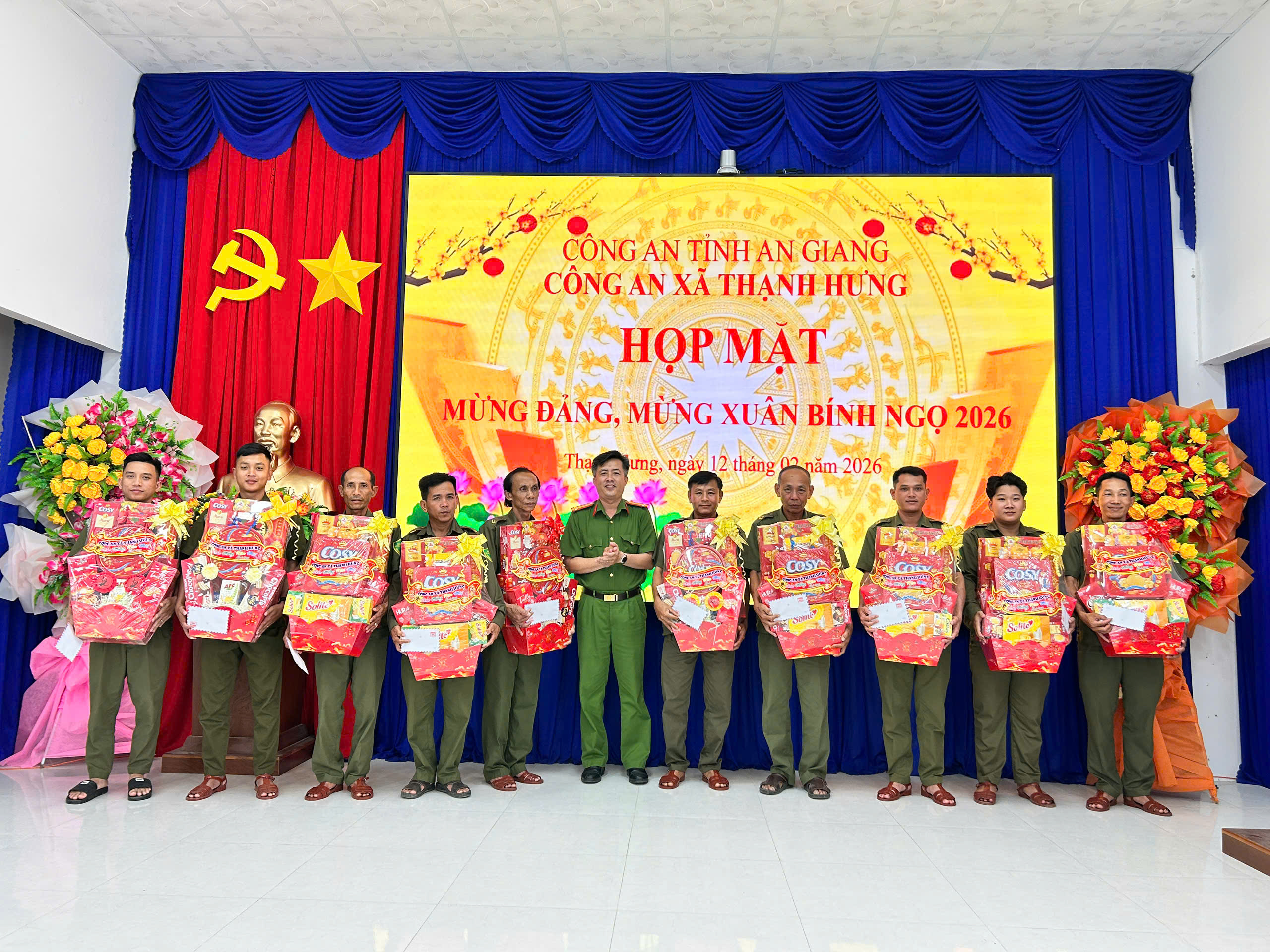 Nhân dịp này, Công an xã Thạnh Hưng tổ chức chương trình họp mặt Mừng Đảng – Mừng Xuân Bính Ngọ năm 2026, đồng thời trao tặng 79 phần quà Tết cho lực lượng tham gia bảo vệ ANTT ở cơ sở nhằm ghi nhận, biểu dương những đóng góp tích cực của lực lượng trong thời gian qua. Đây là hoạt động có ý nghĩa thiết thực, thể hiện sự quan tâm, động viên kịp thời của cấp ủy, chính quyền và lực lượng Công an đối với lực lượng nòng cốt ở cơ sở, qua đó tiếp tục củng cố tinh thần đoàn kết, gắn bó, nâng cao trách nhiệm trong thực hiện nhiệm vụ giữ gìn an ninh, trật tự tại địa phương./.