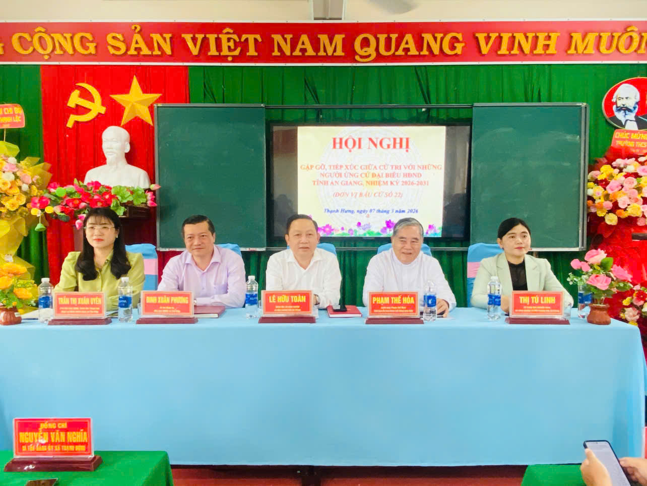 Trong ngày 07/3/2026 và chiều ngày 09/3/2026, những người ứng cử đại biểu HĐND tỉnh An Giang khóa XI, nhiệm kỳ 2026-2031, đơn vị bầu cử số 22 (gồm các xã: Tân Hiệp, Thạnh Đông, Ngọc Chúc và Thạnh Hưng), đã tiếp xúc với cử tri xã Thạnh Hưng tại 03 điểm: Đảng ủy xã, Trường THCS&THPT Thạnh Lộc và UBND xã, gồm: