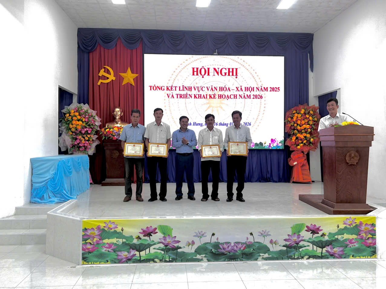Ban hành Quyết định của UBND xã tặng danh hiệu cho 8.229/8.397 hộ gia đình đạt chuẩn văn hóa, đạt 97,99%, tặng danh hiệu cho 21/21 ấp đạt chuẩn văn hóa, đạt 100%; phát động cho 8.457 hộ gia đình và 21/21 ấp đăng ký danh hiệu văn hóa năm 2026. Xây dựng các báo cáo năm 2025 về thực hiện phong trào “Toàn dân đoàn kết xây dựng đời sống văn hóa”, công tác Gia đình.